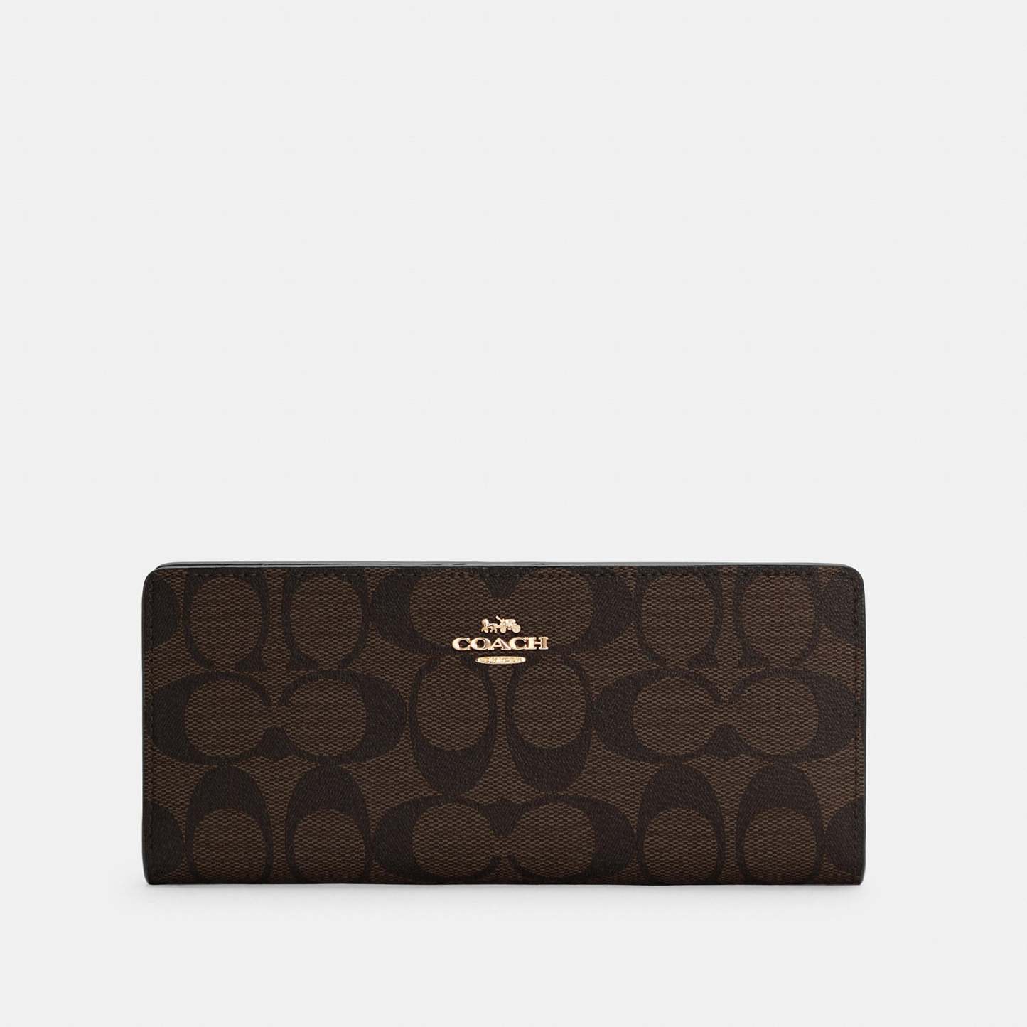 Signature coated canvas and smooth leather 12 credit card slots Full-length bill compartments Snap closure Outside zip pocket Wrist strap attached 7 1/4 (L) x 3 1/2 (H) x 1/2 (W) Style No. C3549 | Outlet Slim Wallet In Signature Canvas - Brown